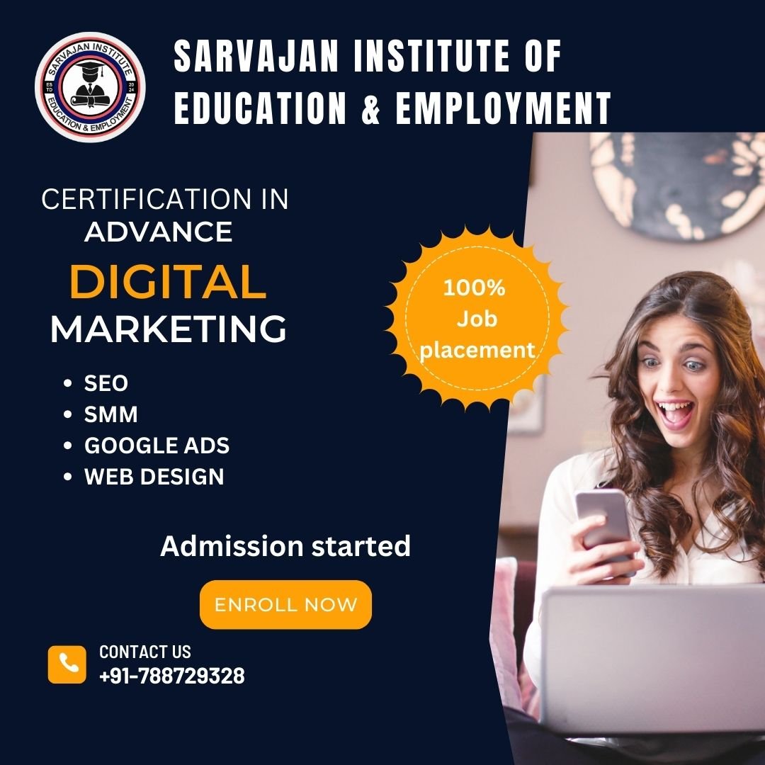 Sarvajan Institute of Education and Employment is Kanpur's leading training institute, specializing in computer literacy, digital literacy, digital marketing, web development, web design, app development, and mobile application development. We are recognized as a top choice for students seeking job-oriented courses in Kanpur that lead to real employment opportunities. With 10+ years of experience and over 10,000 students trained, Sarvajan has built a reputation for delivering 100% placement-focused training programs tailored to meet the skill demands of both government jobs and private sector careers. Our comprehensive curriculum includes 13+ certified professional courses and emphasizes hands-on learning, industry-relevant skills, and practical projects to ensure every student is job-ready upon graduation. Whether you’re a beginner or a professional seeking upskilling, we provide expert-led training to help you build a successful digital career. As the best digital marketing institute in Kanpur and a leader in web development training, Sarvajan Institute is committed to empowering students with cutting-edge digital skills, helping them achieve their career goals in today's fast-paced digital world.